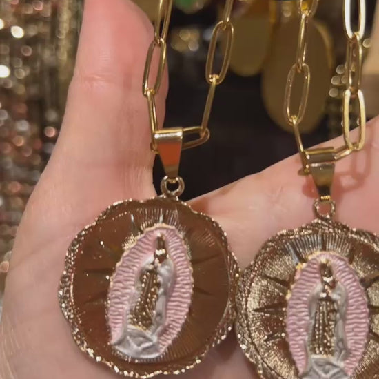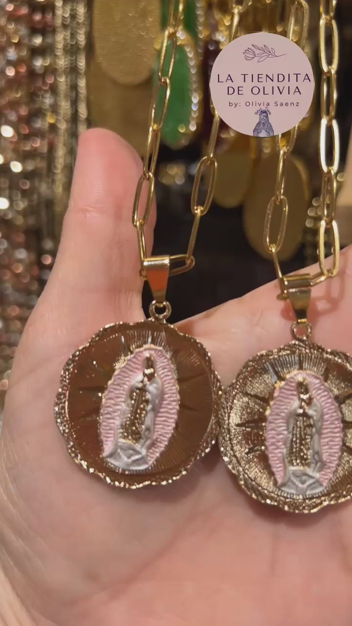 Medalla Virgencita de Guadalupe Oro Laminado Paper Clip Necklace Stainless Steel 34” long