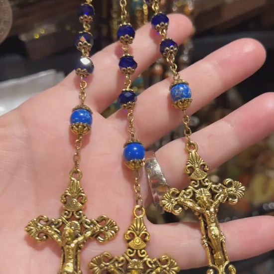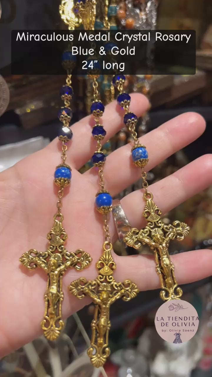 Miraculous Medal Crystal Rosary Blue & Gold 24” long
