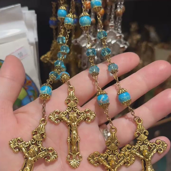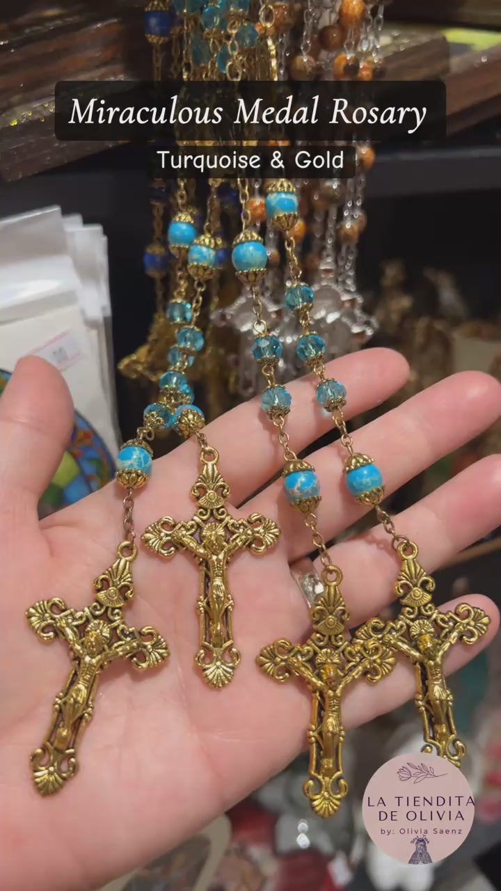Miraculous Medal Crystal Rosary Turquoise & Gold