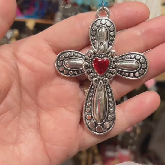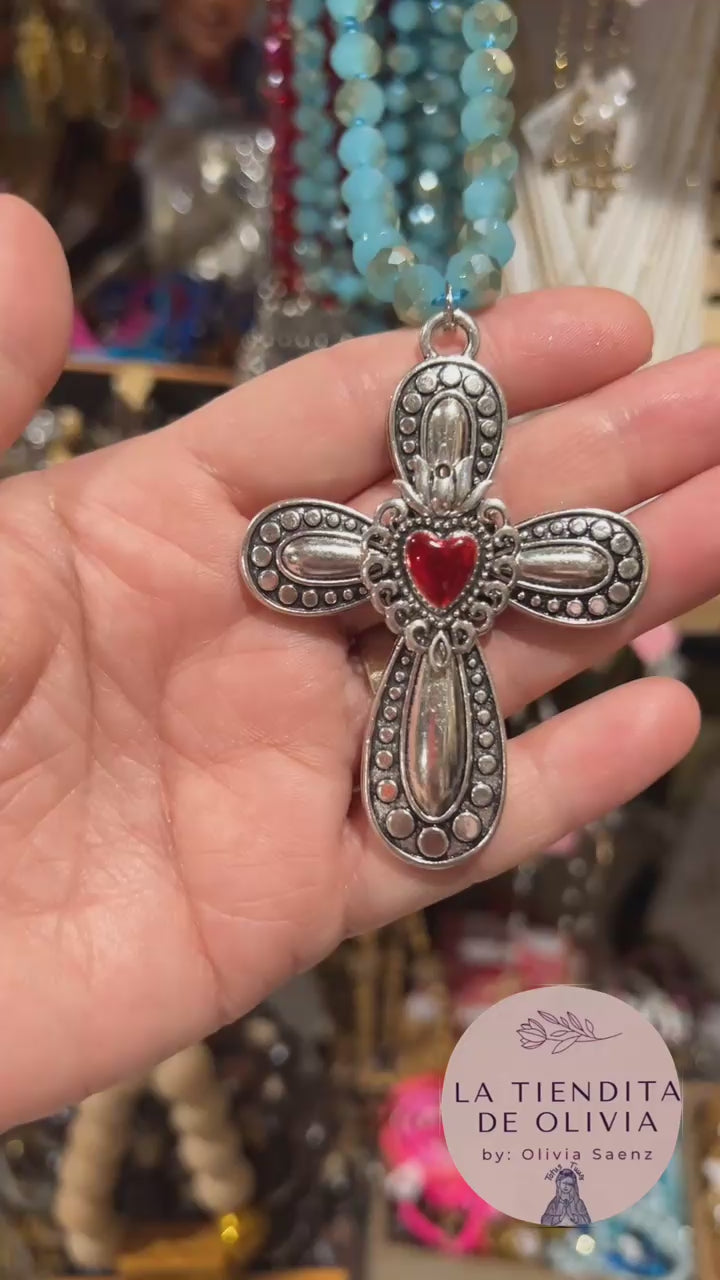 Sacred Heart Cross ❤️ Turquoise & Silver Crystal Necklace - 58” long