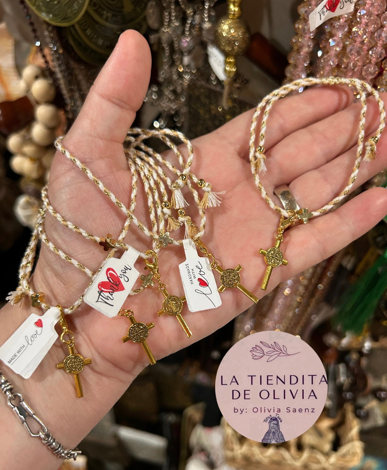 Saint Benedict Gold Cross - Adjustable Bracelet Gold & Beige