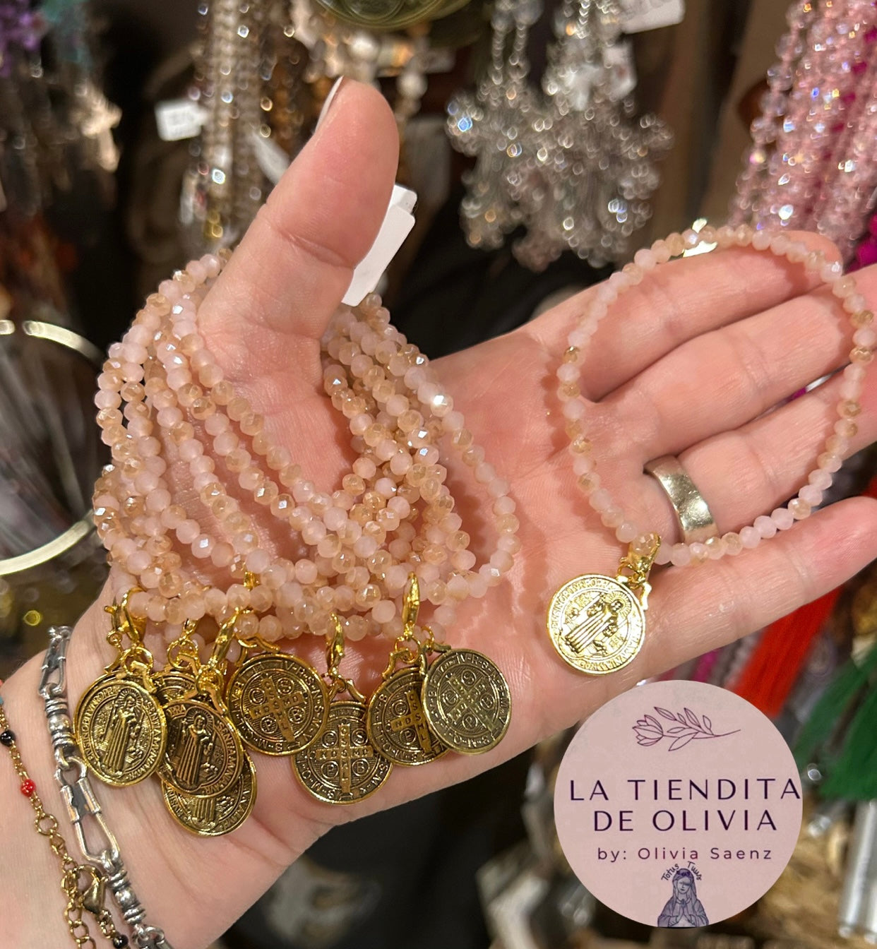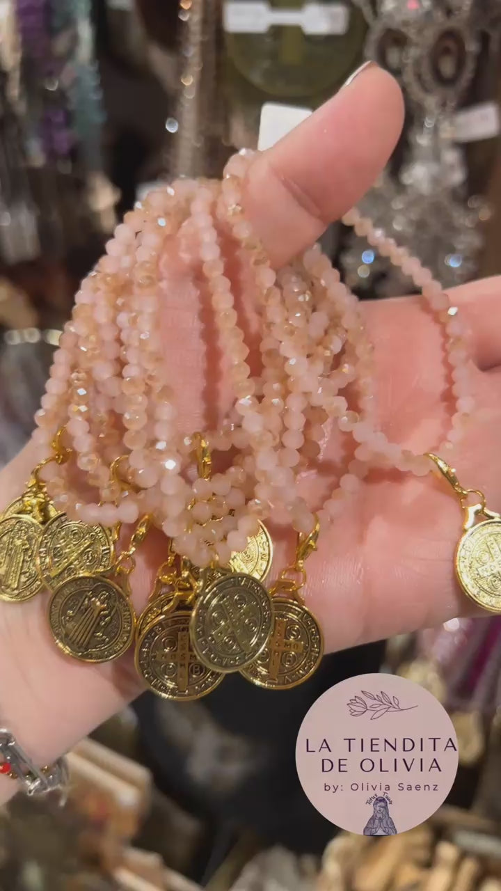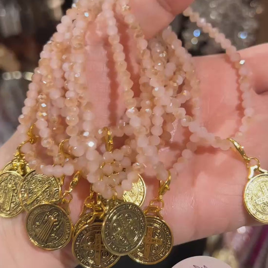 Saint Benedict Gold Medal - Stretch Crystal Bracelet Pink & Champagne Color