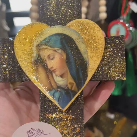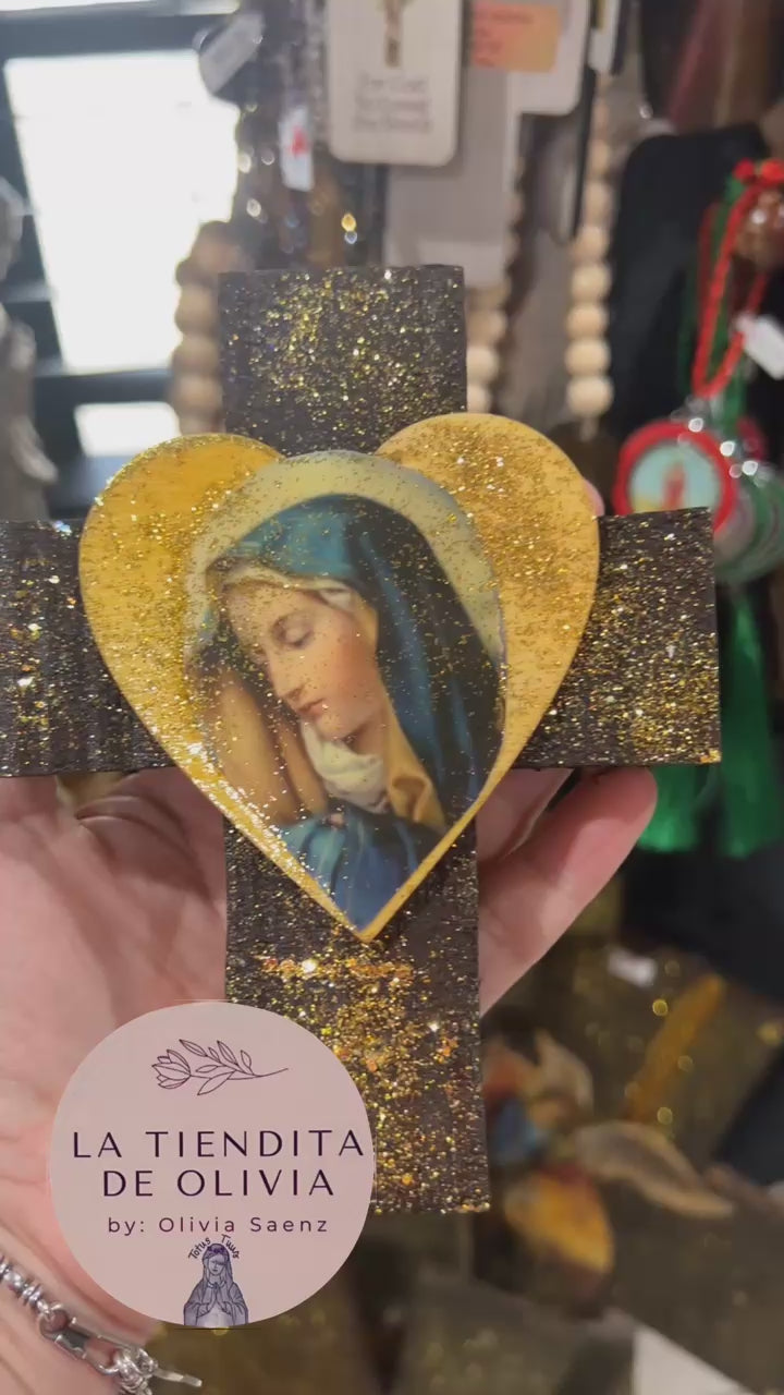 VIRGEN DOLOROSA Mini Cruz de Madera para colgar Medidas aproximadas 4.5" X 6" Elaborada y diseñada por La Tiendita de Olivia