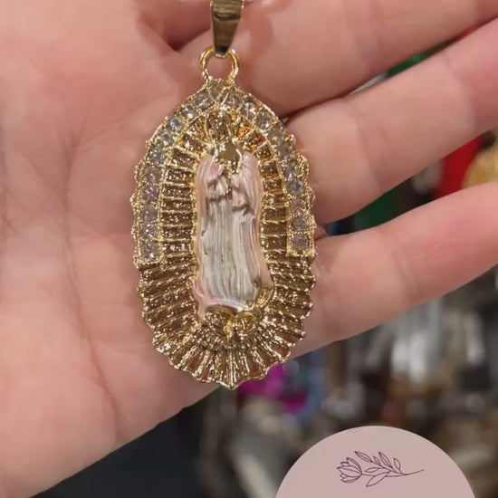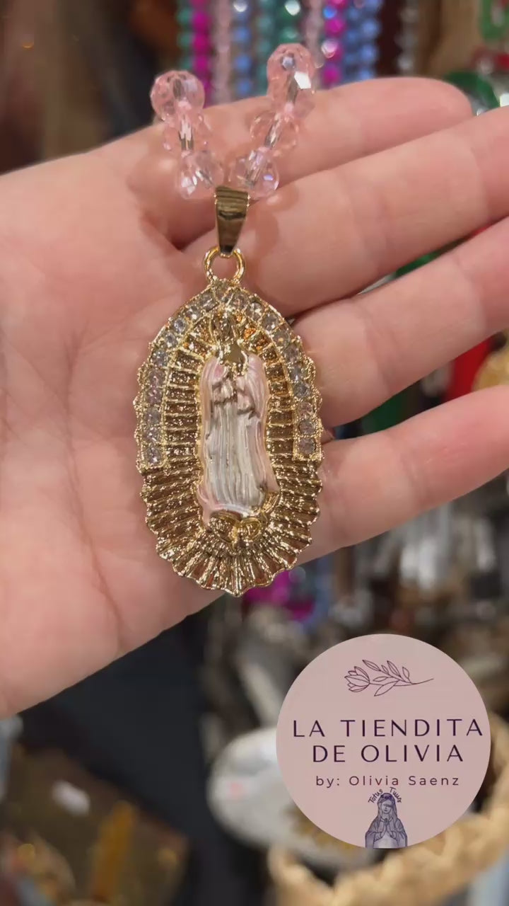 Virgencita de Guadalupe Crystal Necklace - 58” long Medalla Oro Laminado