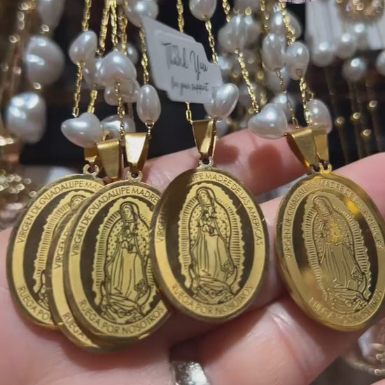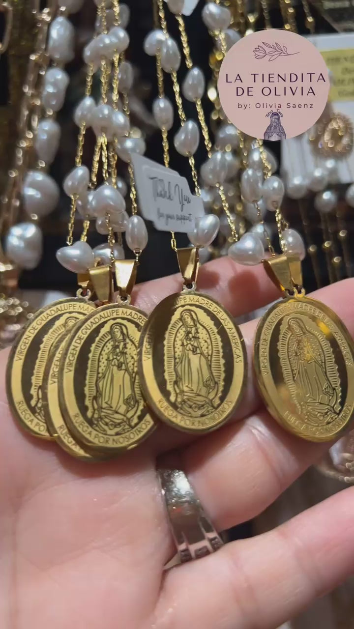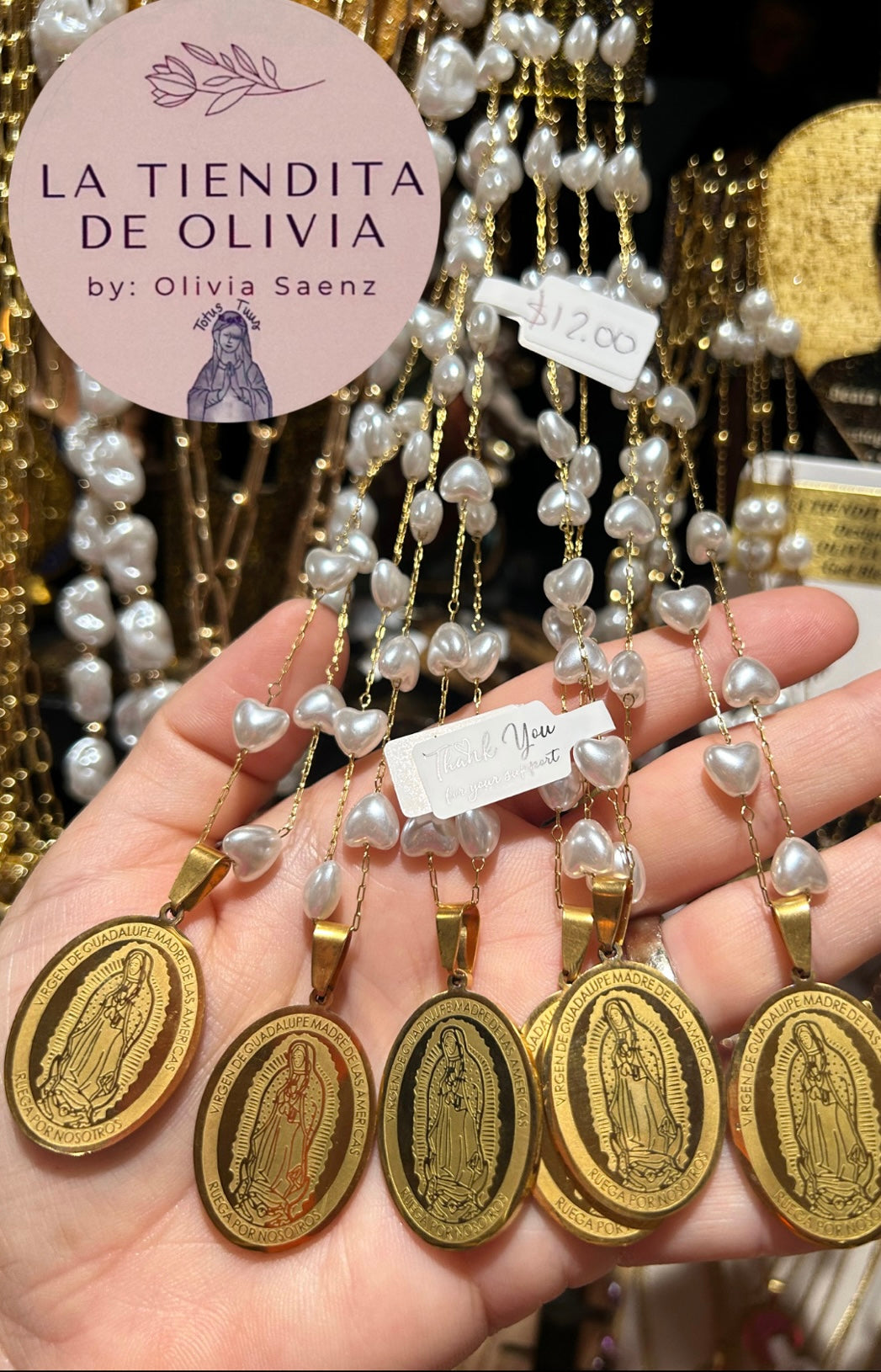 Virgencita de Guadalupe Pearl Heart Necklace Stainless Steel