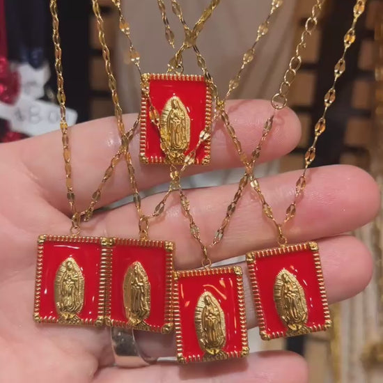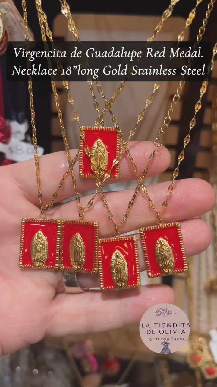 Virgencita de Guadalupe Red Medal. Necklace 18”long Gold Stainless Steel