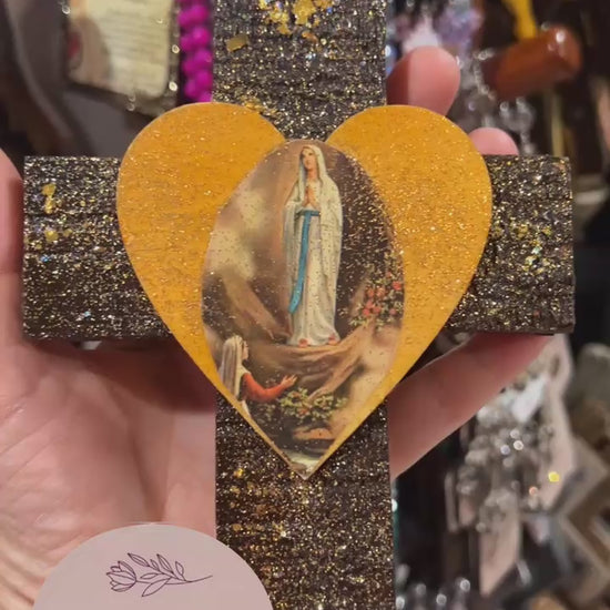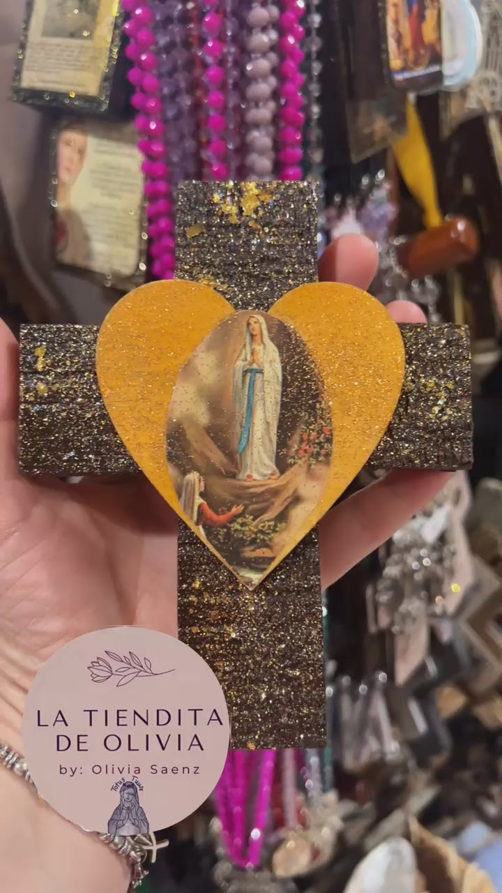 VIRGENCITA DE LOURDES Mini Cruz de Madera para colgar Medidas aproximadas 4.5" X 6" Elaborada y diseñada por La Tiendita de Olivia